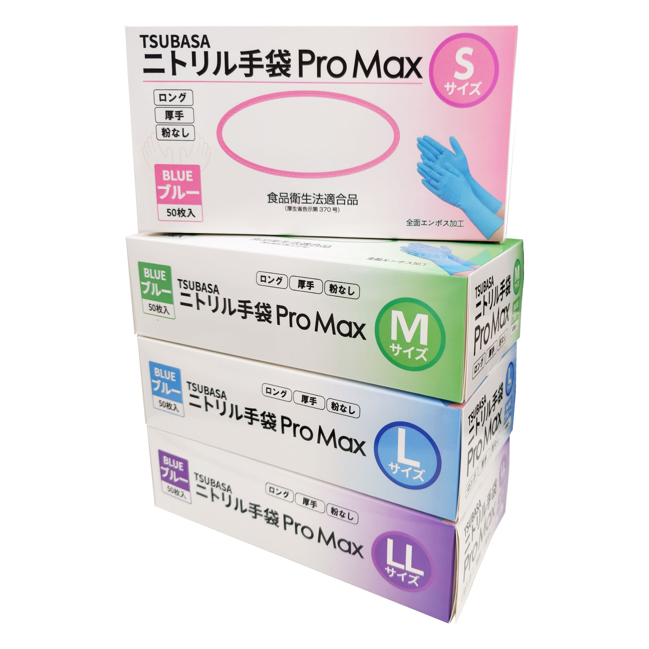 ●TSUBASA ニトリル手袋 ProMax ロングタイプ 厚手 使い捨て手袋 粉なし(パウダーフリー) ブルー Sサイズ 50枚入の商品ページはこちら