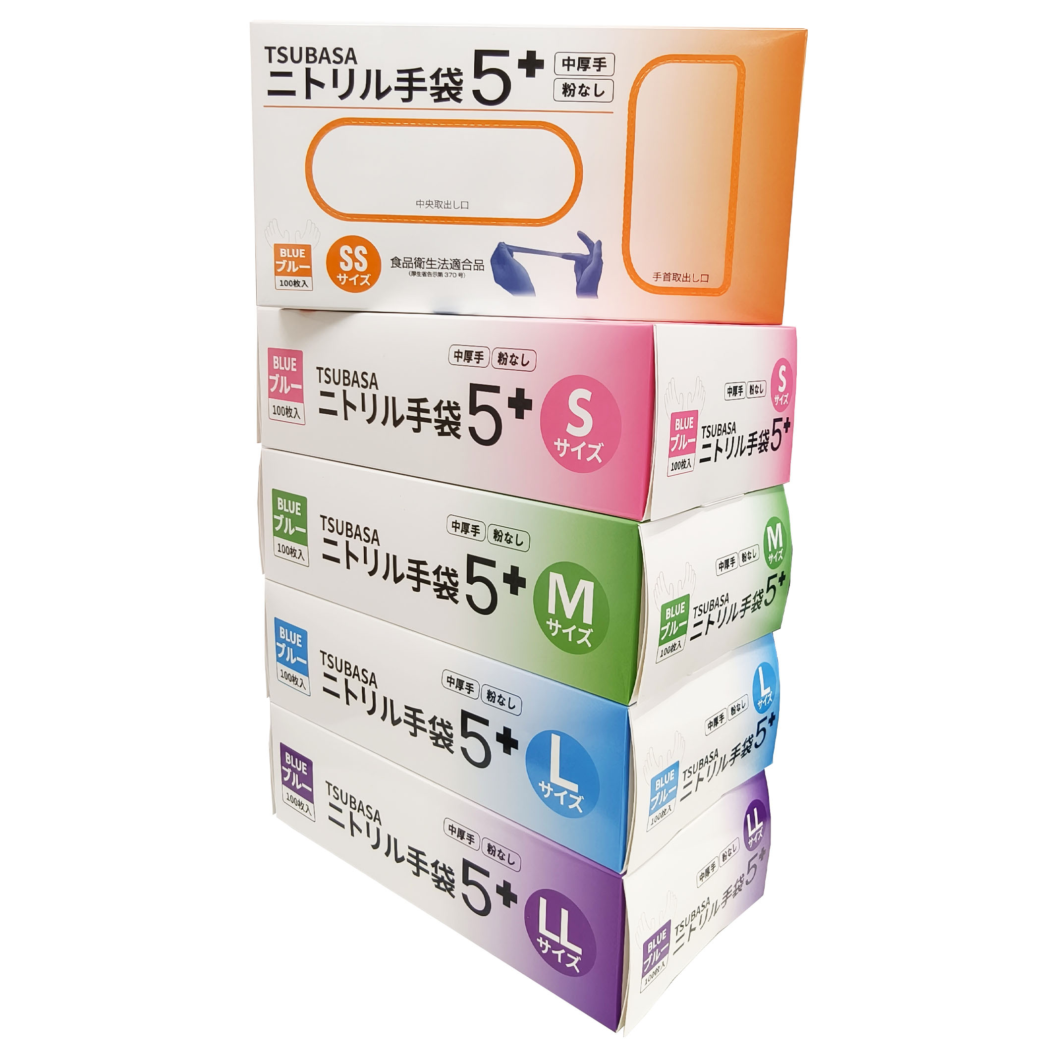 ●TSUBASA ニトリル手袋5⁺ 中厚手 ブルー 粉なし(パウダーフリー) SSサイズ/100枚入の商品ページはこちら