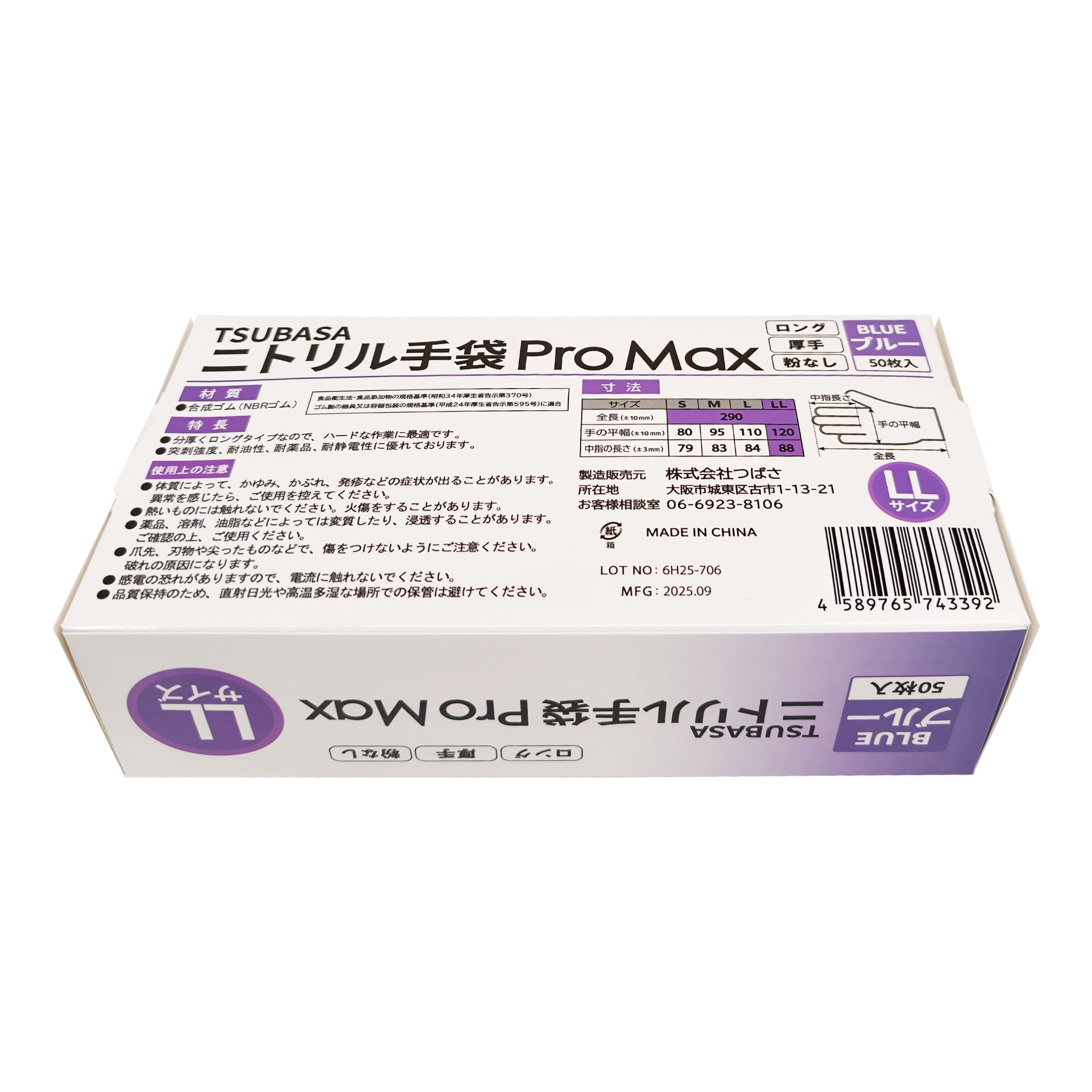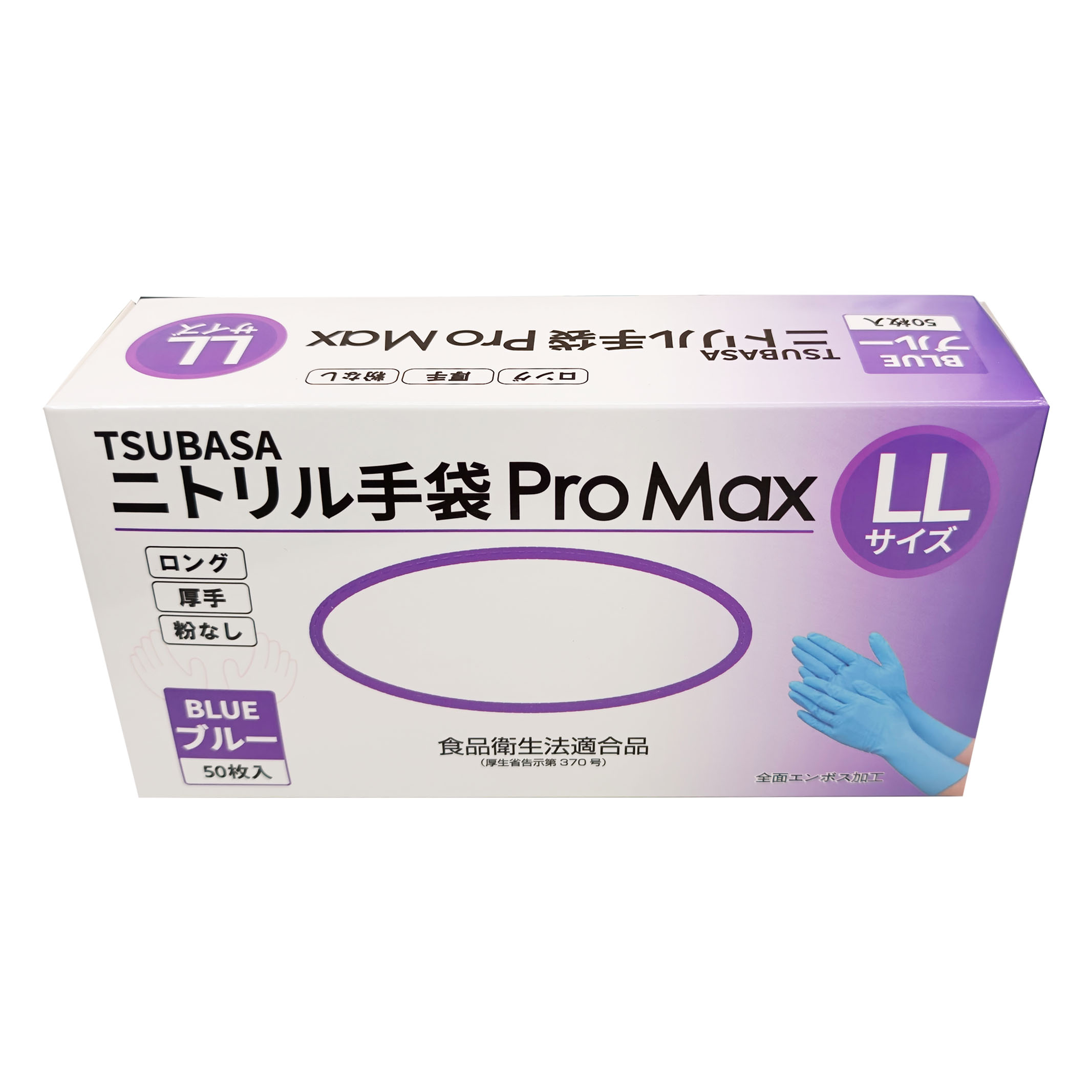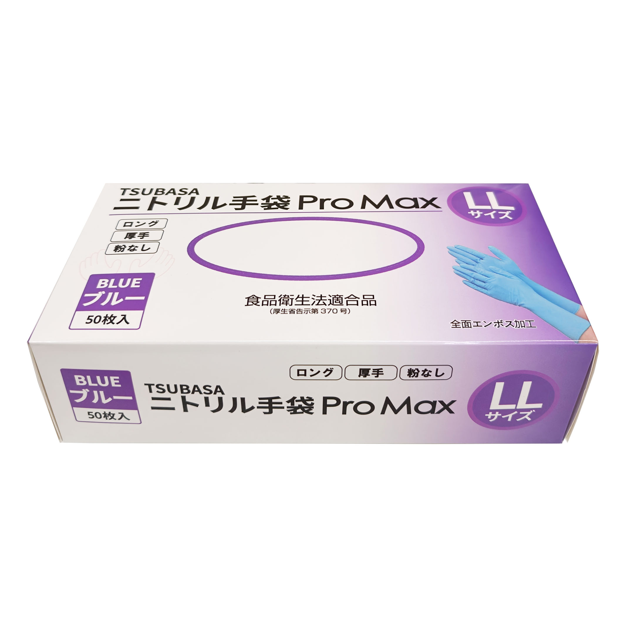 TSUBASA ニトリル手袋 ProMax ロングタイプ 厚手 使い捨て手袋 粉なし(パウダーフリー) ブルー LLサイズ 50枚入